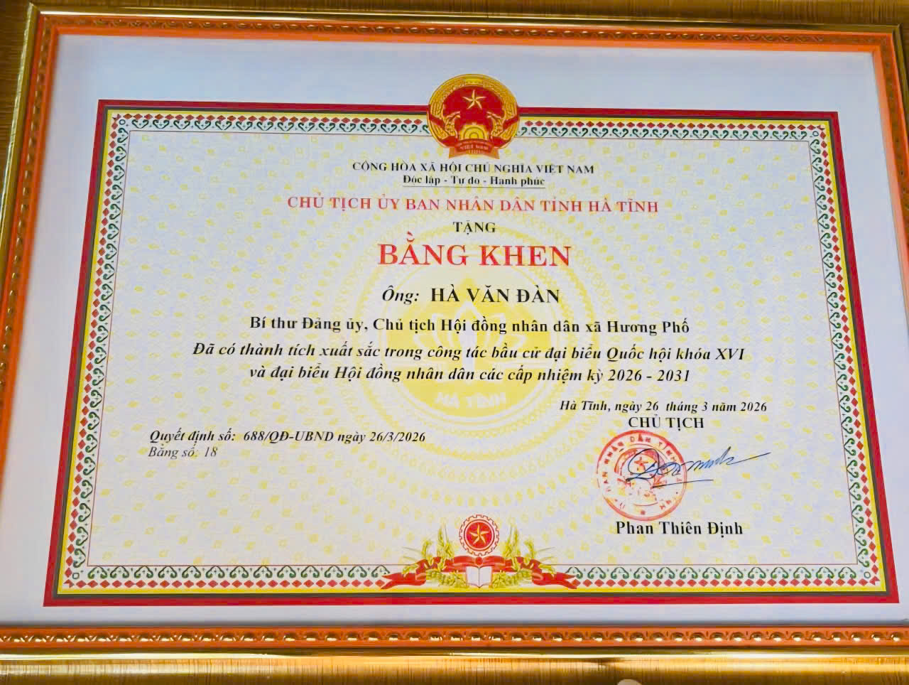 Bằng khen cho cá nhân ông Hà Văn Đàn – Bí thư Đảng ủy, Chủ tịch HĐND xã Hương Phố