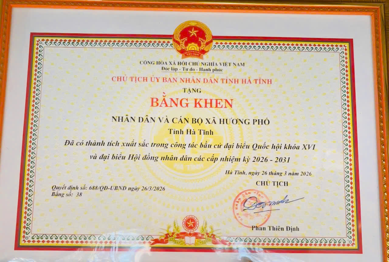 Nhân dịp tổng kết bầu cử đại biểu Quốc hội và HĐND các cấp nhiệm kỳ 2026–2031, nhằm ghi nhận những đóng góp nổi bật trong công tác bầu cử, Chủ tịch Ủy ban nhân dân tỉnh Hà Tĩnh đã quyết định tặng Bằng khen cho Nhân dân và cán bộ xã Hương Phố cùng 01 cá nhân vì có thành tích xuất sắc trong tổ chức bầu cử đại biểu Quốc hội và đại biểu HĐND các cấp nhiệm kỳ 2026–2031.