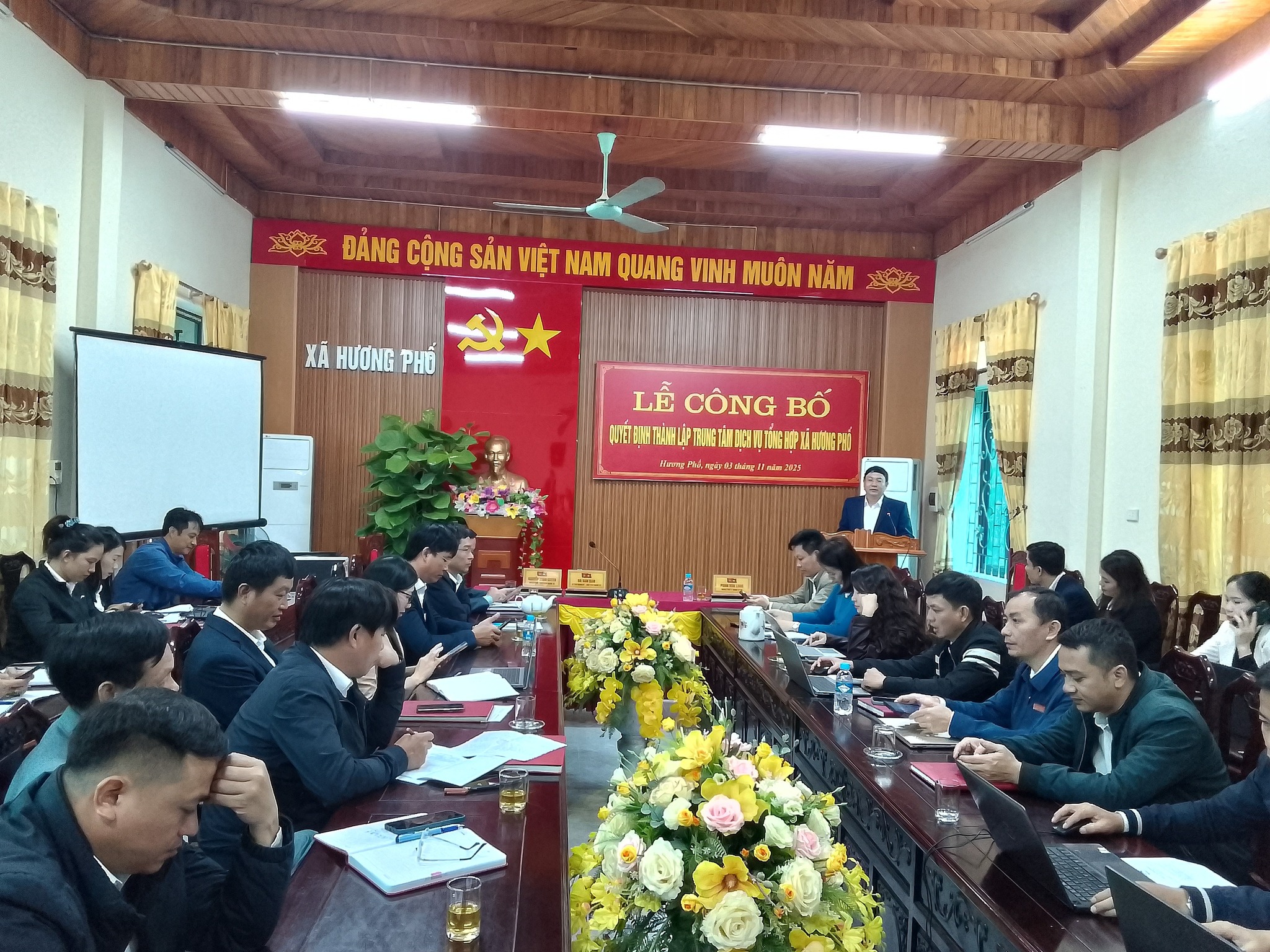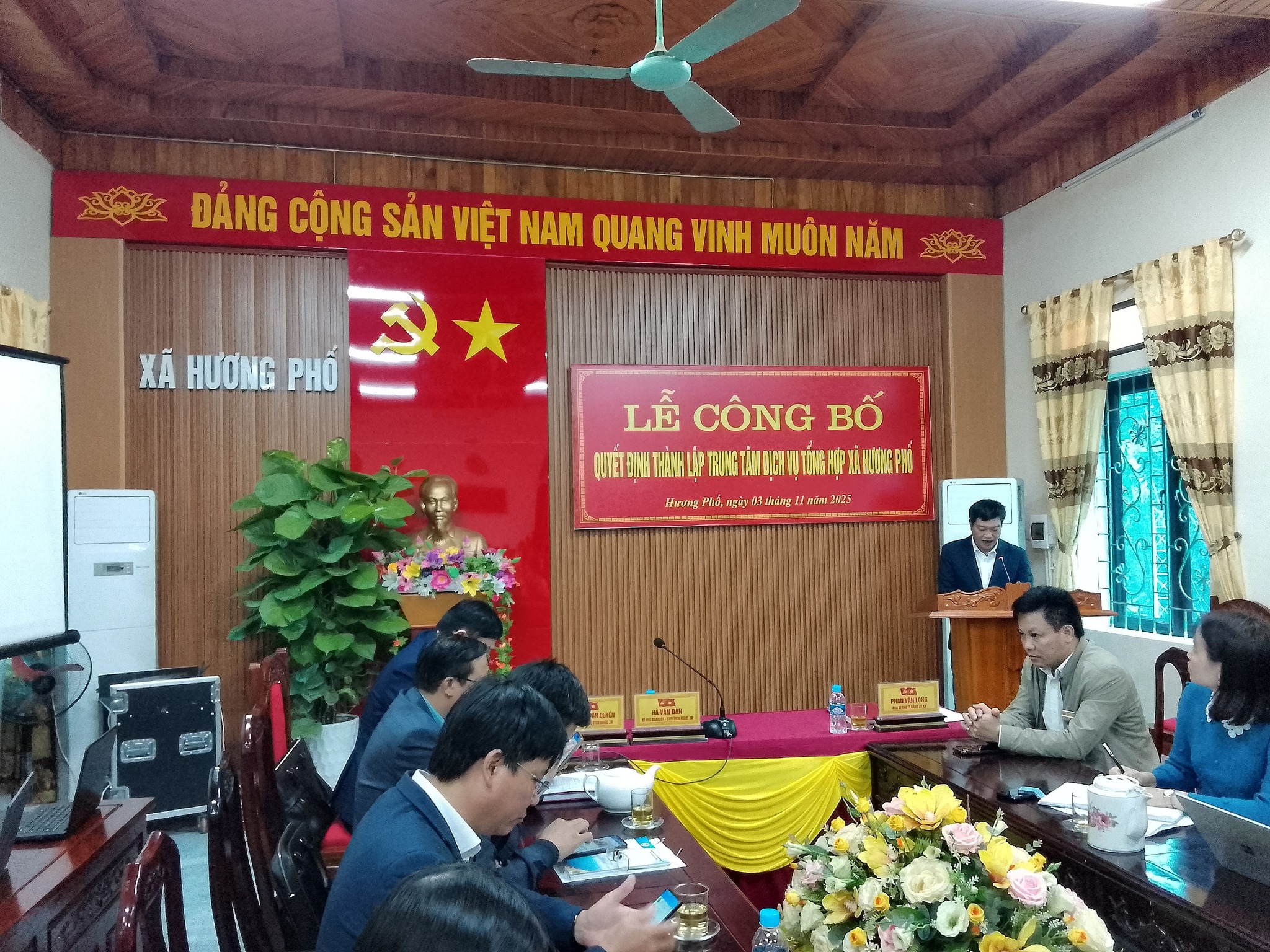 Thay mặt lãnh đạo UBND xã, đồng chí Nguyễn Khánh Dũng – Phó Chủ tịch UBND xã công bố Quyết định thành lập Trung tâm Dịch vụ tổng hợp xã Hương Phố, trực thuộc UBND xã. Trung tâm có chức năng tổ chức các hoạt động dịch vụ hành chính công, dịch vụ nông nghiệp, thương mại, chuyển đổi số cộng đồng và hỗ trợ người dân trong thực hiện các thủ tục hành chính, nhằm nâng cao hiệu quả phục vụ nhân dân, thúc đẩy phát triển kinh tế - xã hội địa phương. Trung tâm gồm Giám đốc, Phó Giám đốc và các viên chức; trụ sở làm việc đặt tại thôn 5, xã Hương Phố (tại trụ sở làm việc cũ của xã Hương Giang).