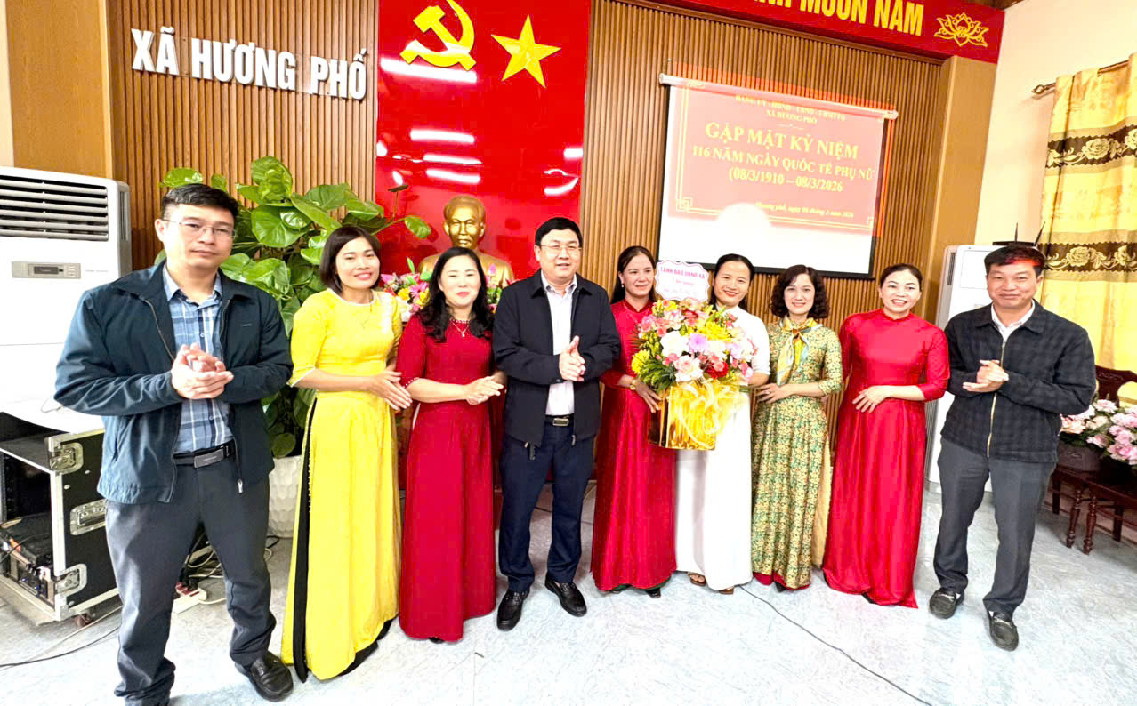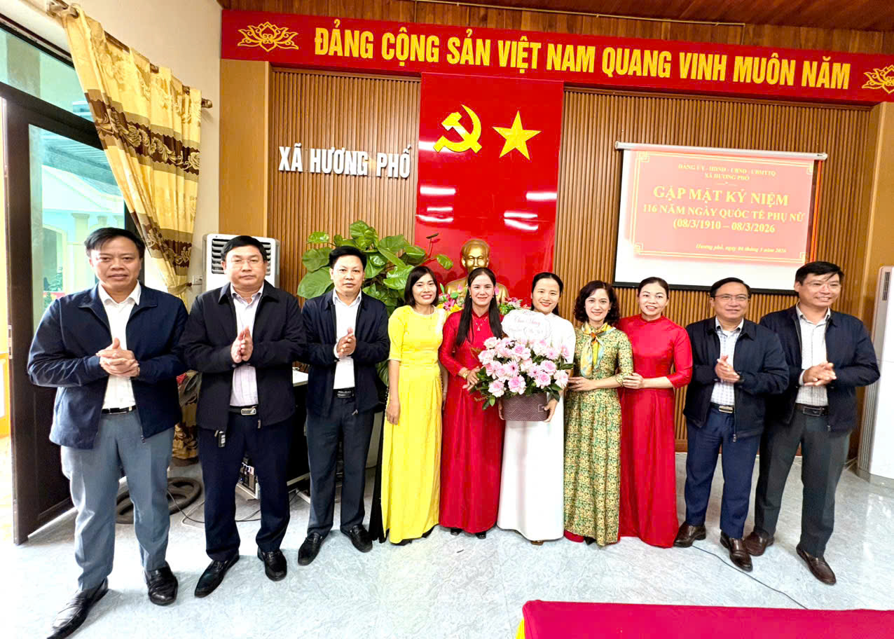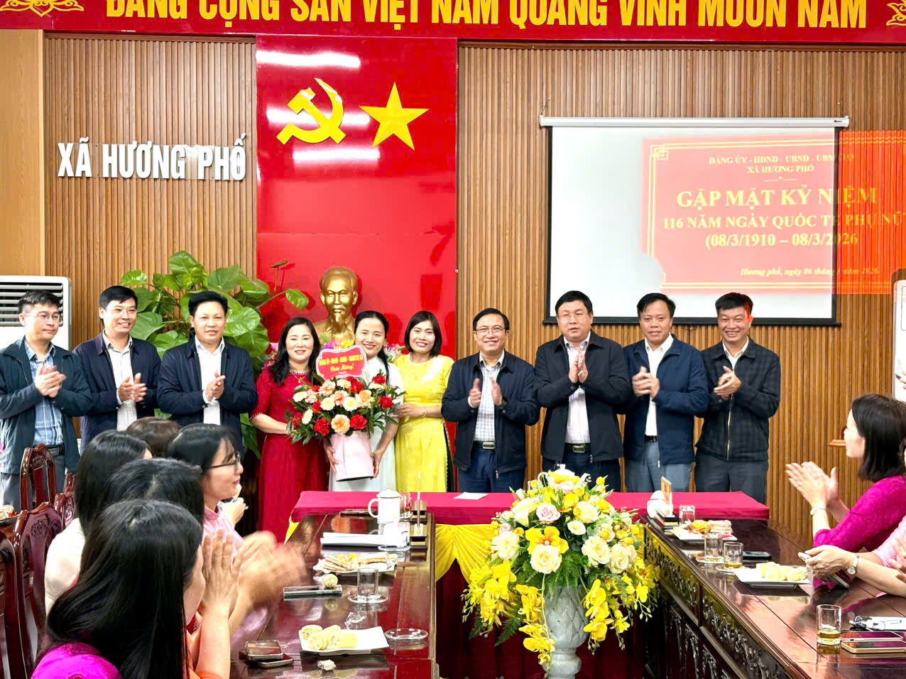 Nhân kỷ niệm 116 năm Ngày Quốc tế Phụ nữ 8/3 (1910 – 2026), sáng nay 6/3, Đảng ủy – HĐND – UBND – Ủy ban MTTQ xã Hương Phố đã tổ chức buổi gặp mặt thân mật nhằm ôn lại truyền thống tốt đẹp của phụ nữ Việt Nam, đồng thời gửi lời tri ân và chúc mừng tới đội ngũ nữ cán bộ, công chức, viên chức đang công tác tại địa phương.