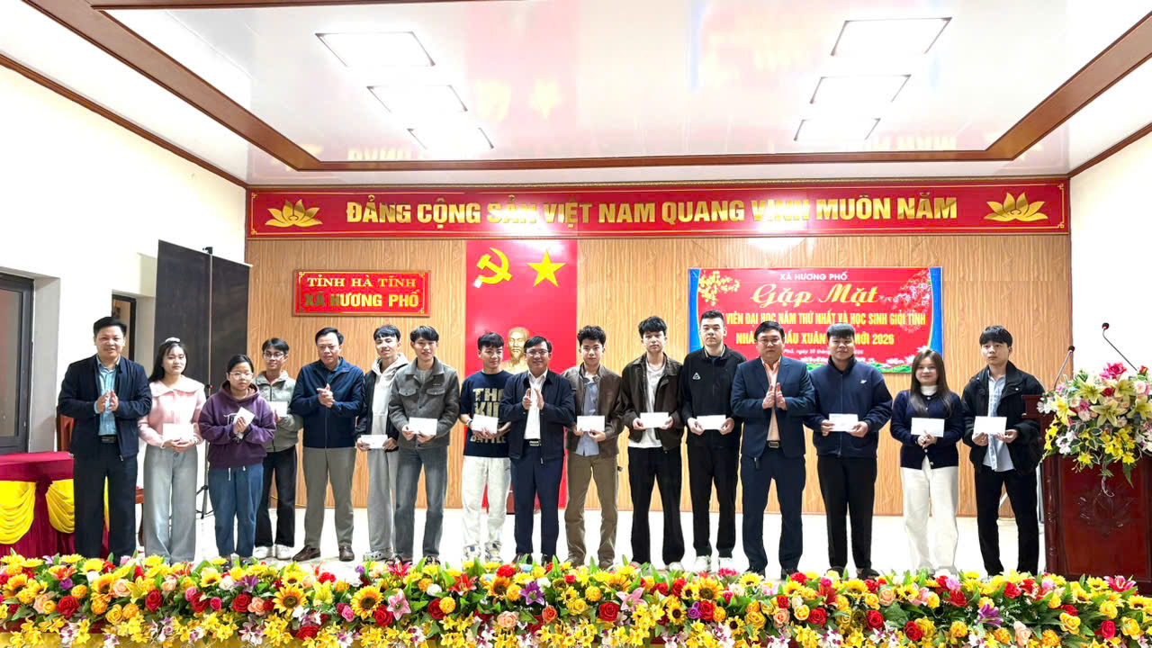 Nhằm động viên, khích lệ tinh thần học tập, rèn luyện của thế hệ trẻ, đồng thời tiếp tục lan tỏa truyền thống hiếu học trên địa bàn; sáng nay 20/02/2026, tức mồng 04 Tết Bính Ngọ xã Hương Phố tổ chức chương trình gặp mặt, tuyên dương và tặng quà cho sinh viên năm thứ nhất và học sinh đạt danh hiệu học sinh giỏi cấp tỉnh năm học 2025–2026. Đây là hoạt động có ý nghĩa thiết thực, thể hiện sự quan tâm sâu sắc của cấp ủy, chính quyền địa phương đối với sự nghiệp giáo dục và đào tạo.