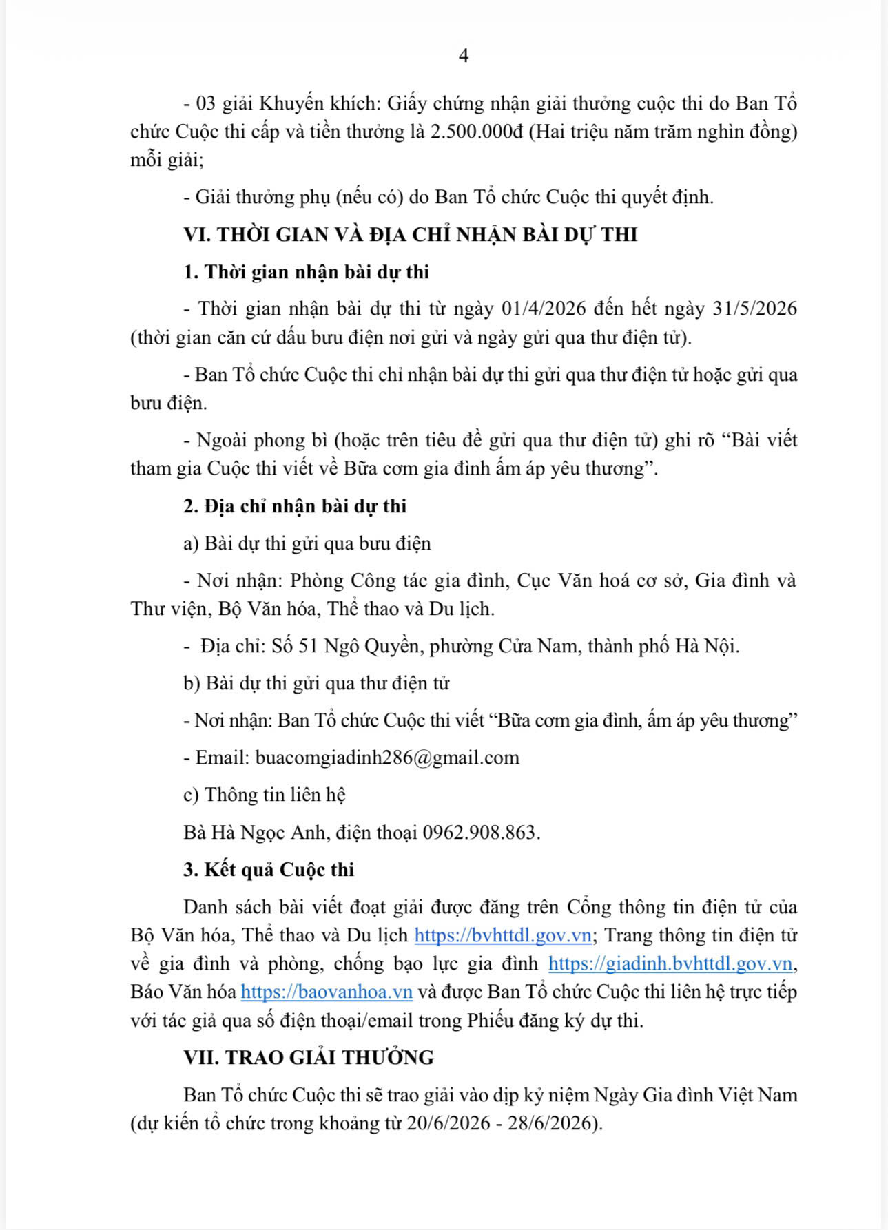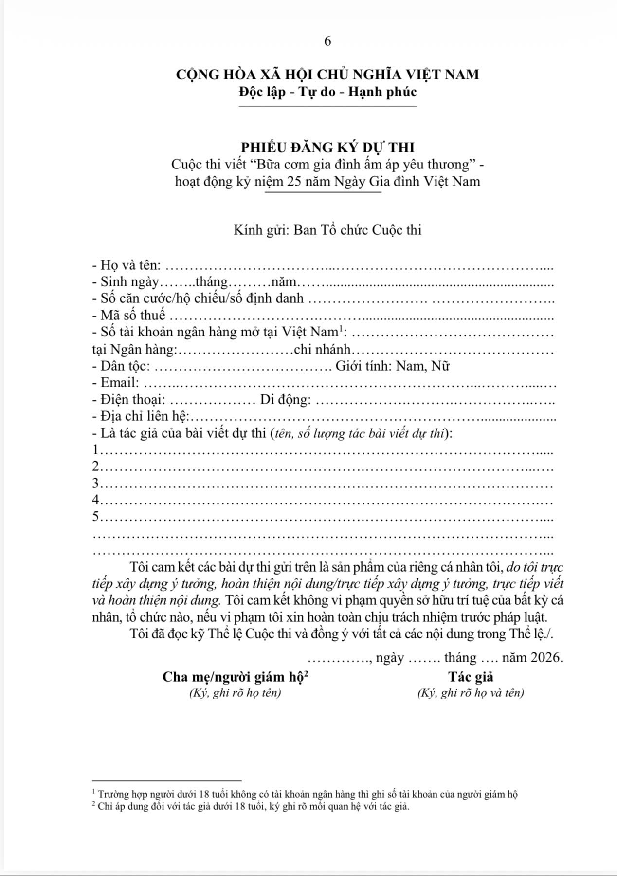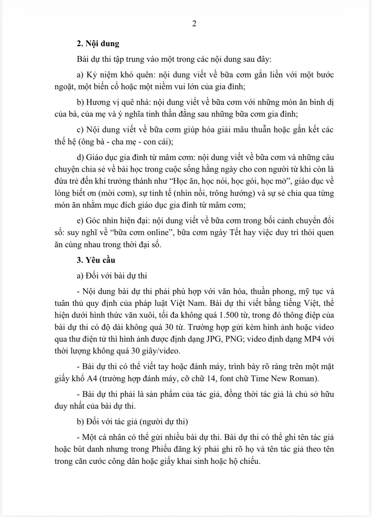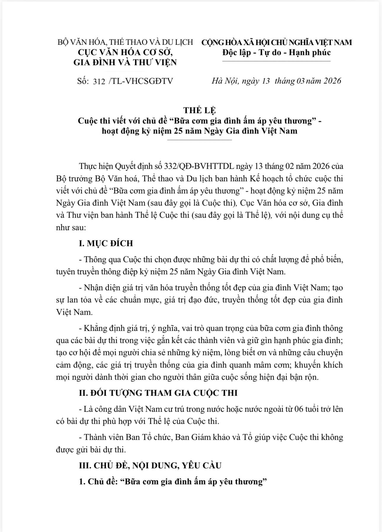 Thể lệ cuộc thi viết với chủ đề " Bữa cơm gia đình ấm áp yêu thương" hoạt động kỷ niệm 25 năm Ngày Gia đình Việt NamMinh Xuân17/03/2026A -A+Minh Xuân17/03/2026A -A+