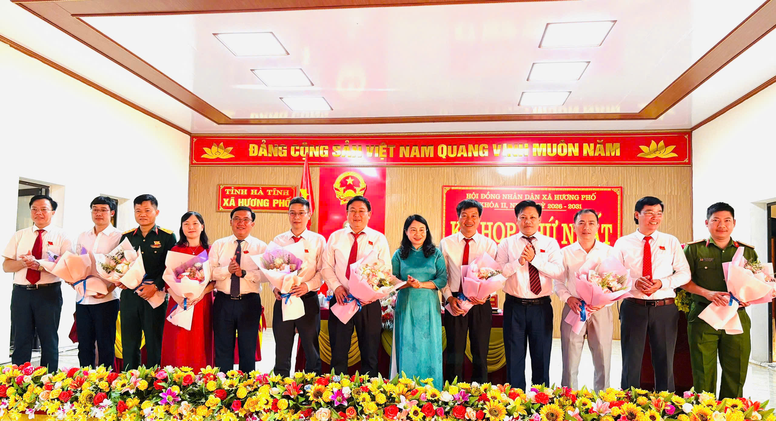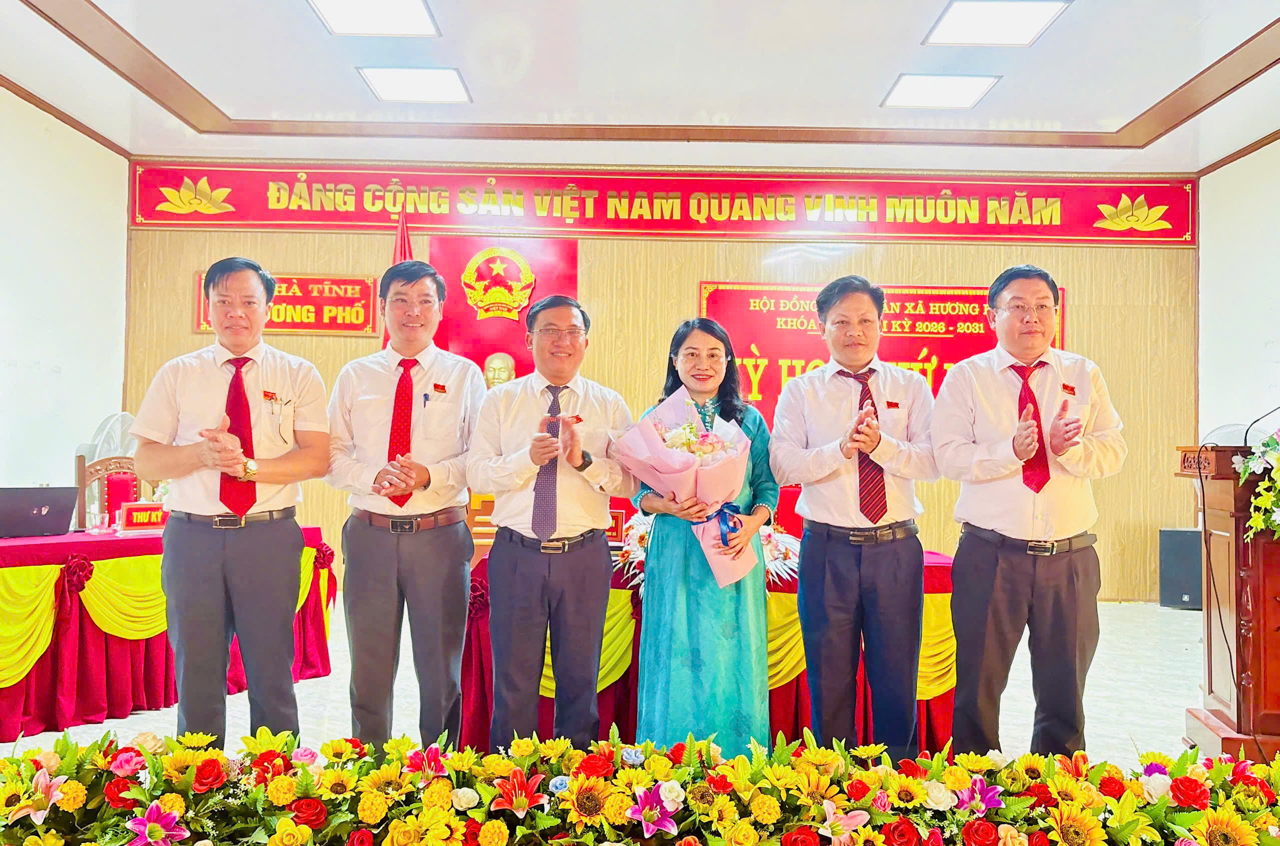 Trưởng ban Pháp chế HĐND tỉnh Nguyễn Thị Nhuần và các đại biểu tặng hoa chúc mừng các đồng chí trúng cử các chức danh chủ chốt UBND và các Ủy viên UBND xã nhiệm kỳ 2026-2031.