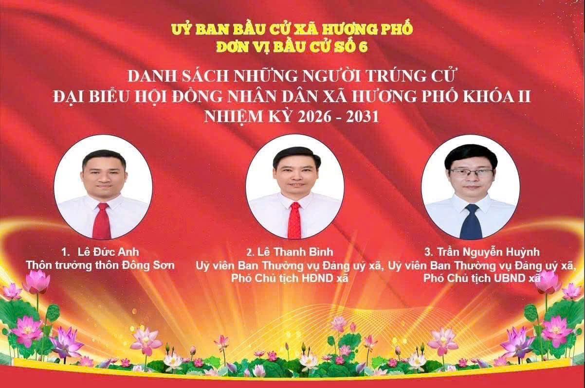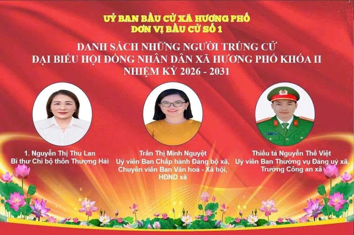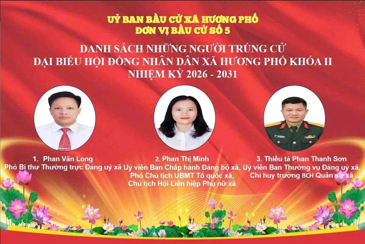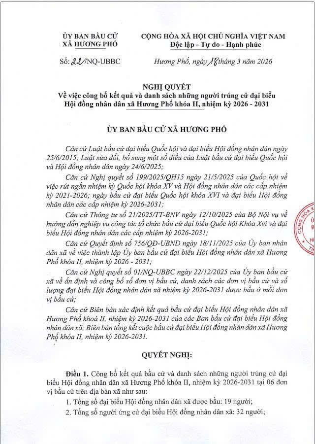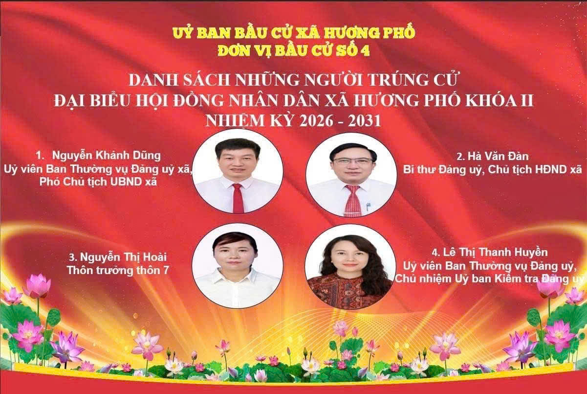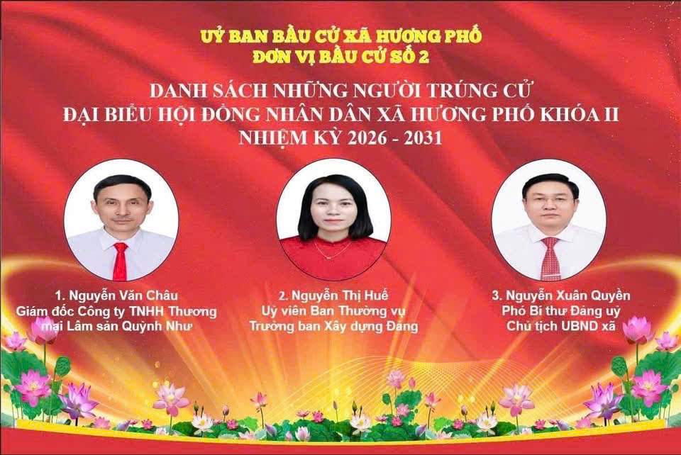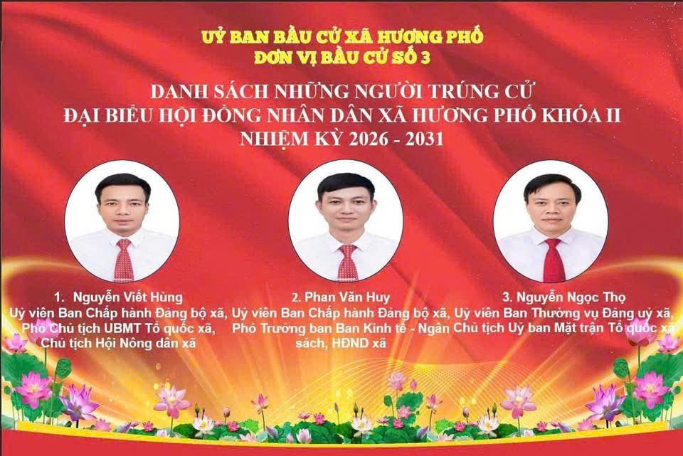 Uỷ ban bầu cử xã Hương Phố công bố danh sách 19 người trúng cử đại biểu HĐND xã khoá II, nhiệm kỳ 2026-2031.Minh Xuân19/03/2026A -A+Minh Xuân19/03/2026A -A+