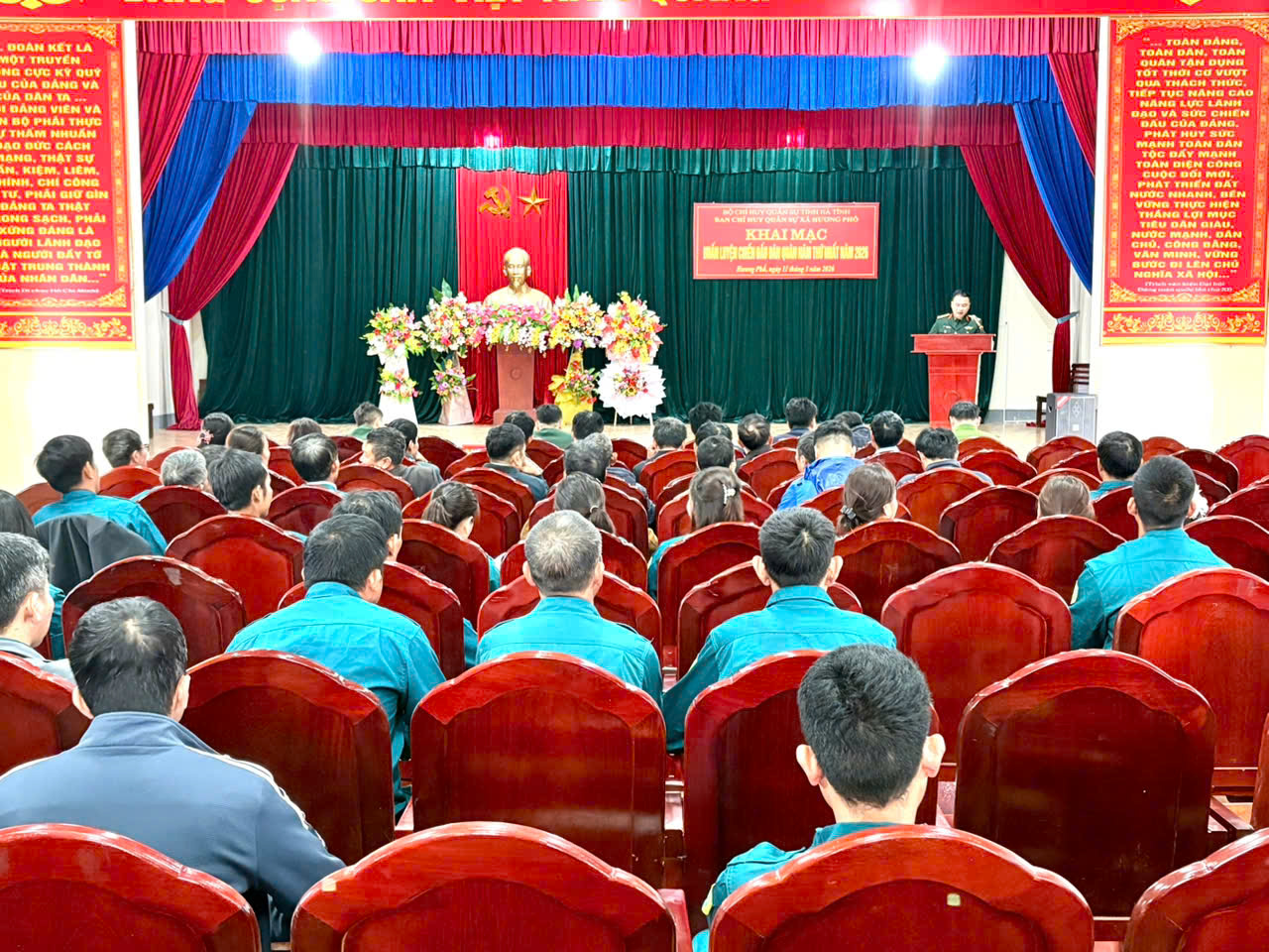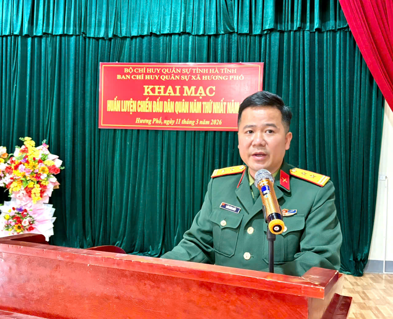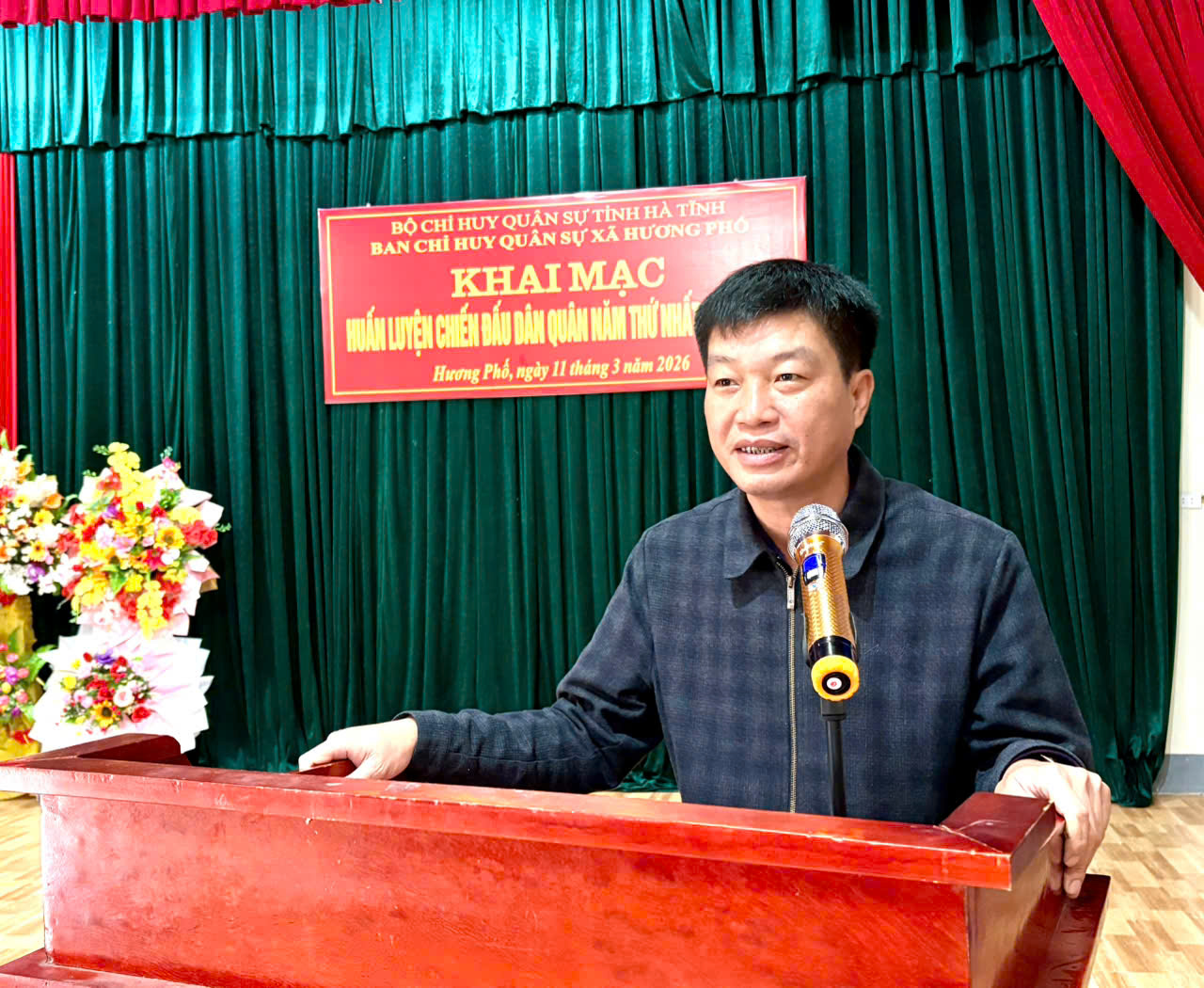 Sáng ngày 11/3/2026, Ban Chỉ huy Quân sự (CHQS) xã Hương Phố tổ chức khai mạc huấn luyện cho lực lượng Dân quân năm thứ nhất năm 2026. Tham dự buổi lễ có đồng chí Phan Văn Long – Phó Bí thư Thường trực Đảng ủy; đồng chí Nguyễn Khánh Dũng – Ủy viên Ban Thường vụ Đảng ủy, Phó Chủ tịch UBND xã; đại diện Ủy ban MTTQ, các ban, ngành, đoàn thể cùng 55 chiến sĩ dân quân năm thứ nhất. Đợt huấn luyện được triển khai thực hiện theo Kế hoạch số 133/KH-BCH ngày 21/01/2026 của Bộ Chỉ huy Quân sự tỉnh Hà Tĩnh về huấn luyện chiến đấu giai đoạn I năm 2026.
